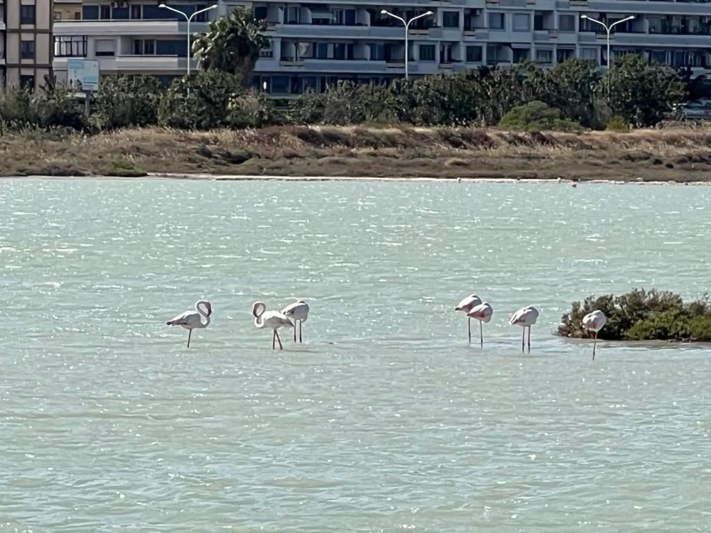A part után elsétáltunk a közelben lévő két tóhoz, ahol a flamingók tanyáznak. Pontosabban rózsás flamingók, akik karibi rokonaiknál jóval fakóbbak. Szárnyuk fekete és pink. Repülés közben úgy néznek ki, mint a gólyák, bár csoportban röpködnek, és libaszerű hangot adnak ki magukból. Fakó színük étrendjüknek köszönhető. Fő táplálékuk a garnéla. A garnéla nagy mennyiségben tartalmaz pigmenteket, karotint, melyből a színüket nyerik. De valószínűleg nem annyit, mint karibi társaiké.